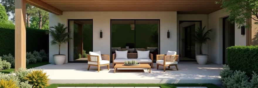 Les terrasses et les patios sont des éléments clés pour créer une transition douce entre l’intérieur et l’extérieur. Ils doivent être conçus comme une extension naturelle de la maison, tant dans leur style que dans leurs matériaux. Par exemple, une terrasse en bois composite peut reprendre la teinte du parquet intérieur, créant ainsi une continuité visuelle. L’agencement du mobilier de jardin sur ces espaces doit également refléter l’ambiance intérieure pour une cohérence globale.